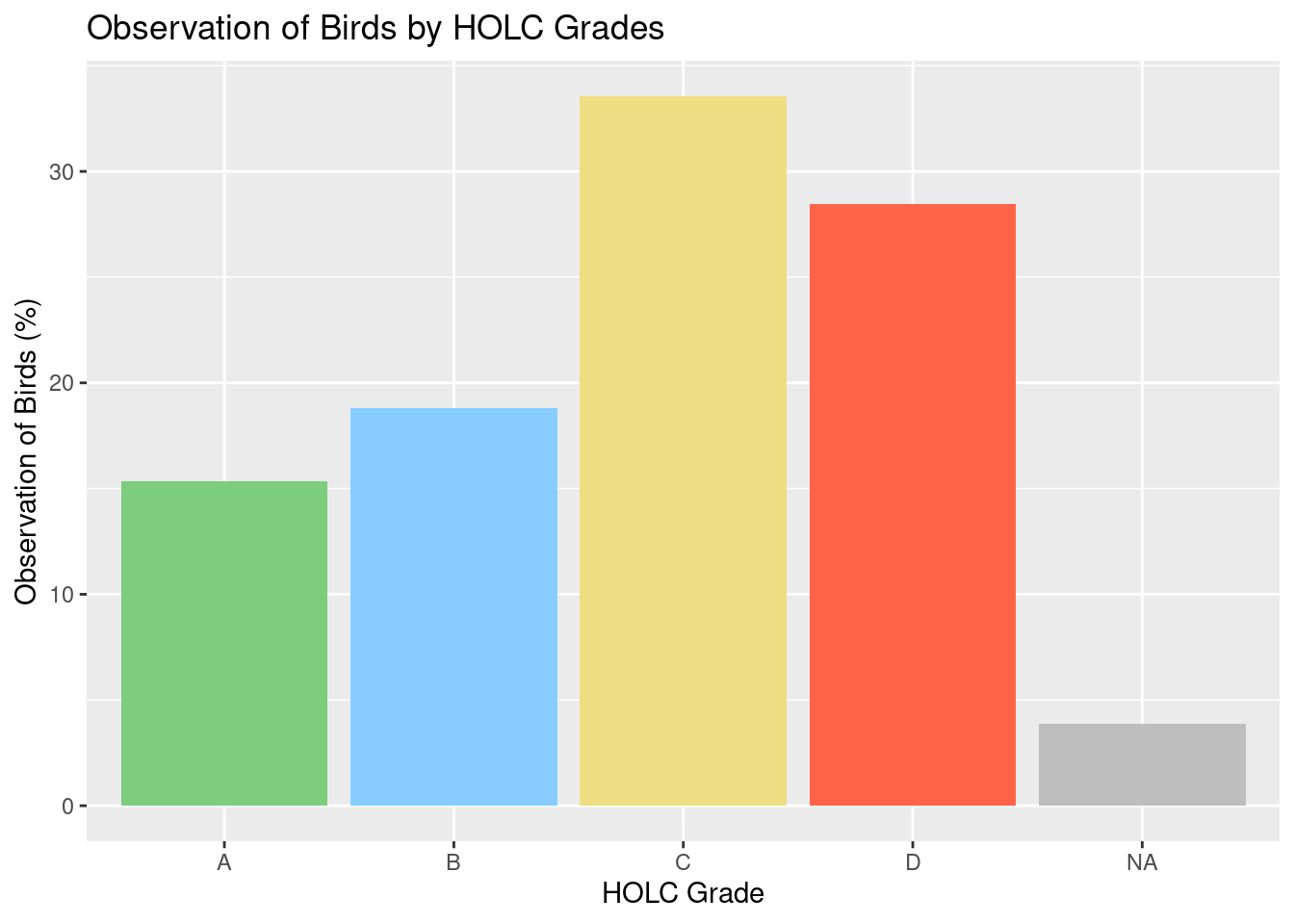 My results do not align with the ‘Bird Biodiversity Reports Reflect Cities’ Redlined Past’. Unlike the paper, my bar plot shows that regions with an ‘A’ grade actually have the least amount of bird observations, and ‘C’ has the most. However, this makes sense because as seen in the earlier table, there are many more areas graded as ‘C’ compared to ‘A’, so there would be more birds seen in ‘C’. If the bird observations were weighted based on the density of the grades, the plot might align more closely with the results of the article.