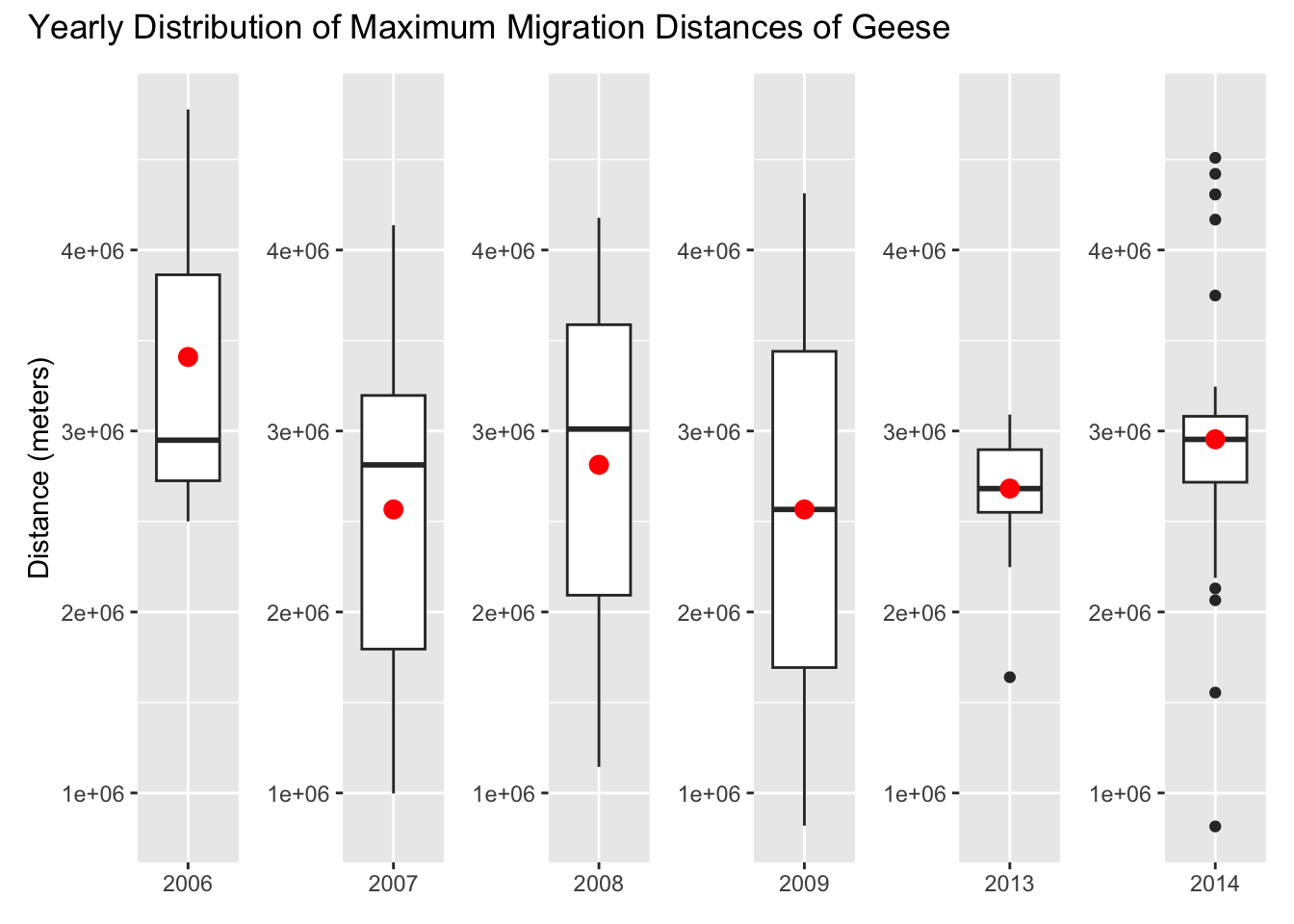 # Set y_limits so each y-axis is the same, and it is easier to comparey_limits <-range(geese_group$max_distance, na.rm =TRUE)b2006 <-ggplot(geese_2006, aes(x ="2006", y = max_distance)) +geom_boxplot() +stat_summary(fun = mean, geom ="point", color ="red", size =3) +scale_y_continuous(limits = y_limits) +labs(y ="Distance (meters)") +theme(axis.title.x =element_blank()) # Turn off x-axis labelb2007 <-ggplot(geese_2007, aes(x ="2007", y = max_distance)) +geom_boxplot() +stat_summary(fun = mean, geom ="point", color ="red", size =3) +scale_y_continuous(limits = y_limits) +theme(axis.title.x =element_blank(), # Turn off x-axis labelaxis.title.y =element_blank())b2008 <-ggplot(geese_2008, aes(x ="2008", y = max_distance)) +geom_boxplot() +stat_summary(fun = mean, geom ="point", color ="red", size =3) +scale_y_continuous(limits = y_limits) +theme(axis.title.x =element_blank(), # Turn off x-axis labelaxis.title.y =element_blank())b2009 <-ggplot(geese_2009, aes(x ="2009", y = max_distance)) +geom_boxplot() +stat_summary(fun = mean, geom ="point", color ="red", size =3) +scale_y_continuous(limits = y_limits) +theme(axis.title.x =element_blank(), # Turn off x-axis labelaxis.title.y =element_blank())b2013 <-ggplot(geese_2013, aes(x ="2013", y = max_distance)) +geom_boxplot() +stat_summary(fun = mean, geom ="point", color ="red", size =3) +scale_y_continuous(limits = y_limits) +theme(axis.title.x =element_blank(), # Turn off x-axis labelaxis.title.y =element_blank())b2014 <-ggplot(geese_2014, aes(x ="2014", y = max_distance)) +geom_boxplot() +stat_summary(fun = mean, geom ="point", color ="red", size =3) +scale_y_continuous(limits = y_limits) +theme(axis.title.x =element_blank(), # Turn off x-axis labelaxis.title.y =element_blank())(b2006 | b2007 | b2008 | b2009 | b2013 | b2014) +plot_annotation(title ="Yearly Distribution of Maximum Migration Distances of Geese")