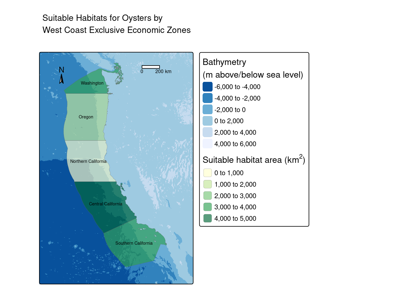 main.title = "Suitable Habitats for Oysters by \nWest Coast Exclusive Economic Zones")